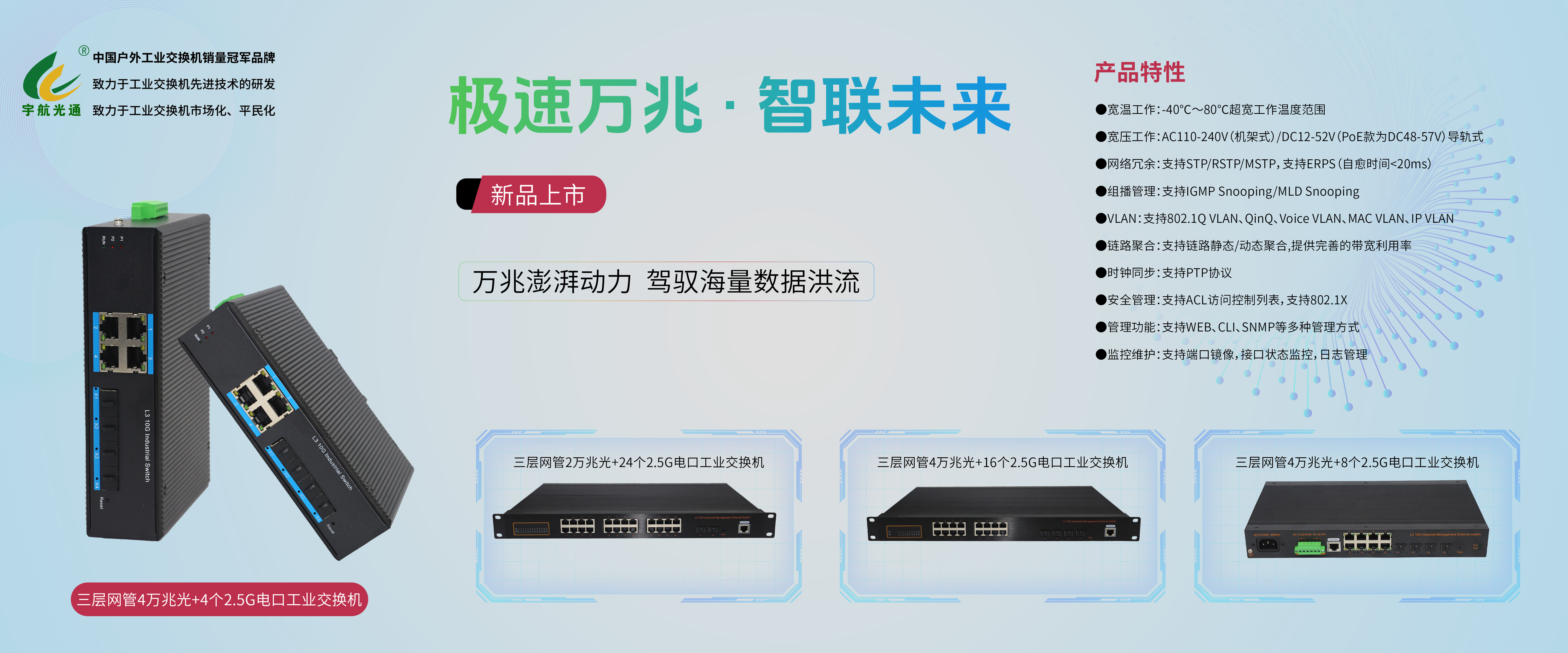 深圳市宇航光通科技有限公司總部位于深圳,是一家聚焦工業以太網產品研發,生產,銷售和服務為主營業務的國家專精特“小巨人”和國高、深高的科技企業,為客戶提供高性價比的工業以太網產品和解決方案。宇航是國產工業交換機最大的源頭廠商,被人稱為“工業交換機沃爾瑪”,聚焦工業交換機產品,質量做到極致、價格做到極致、服務做到極致。宇航在工業以太網產品領域獲得了多項創新型的技術成果,連續多年中國工業產品十大品牌、十大安防品牌,連續三年中國信創產業500強,中國信創產業獨角獸100強,中國信創產業領軍企業100強,工信部、公安部等智慧城市首推品牌,宇航光通專注于工業交換機品牌渠道和項目市場,以及中大型客戶OEM/ODM市場。宇航,全國產工業交換機發起單位,讓全世界都能用上中國制造的工業交換機。宇航,致力于工業交換機先進技術的研發,致力于工業交換機市場化和平民化。