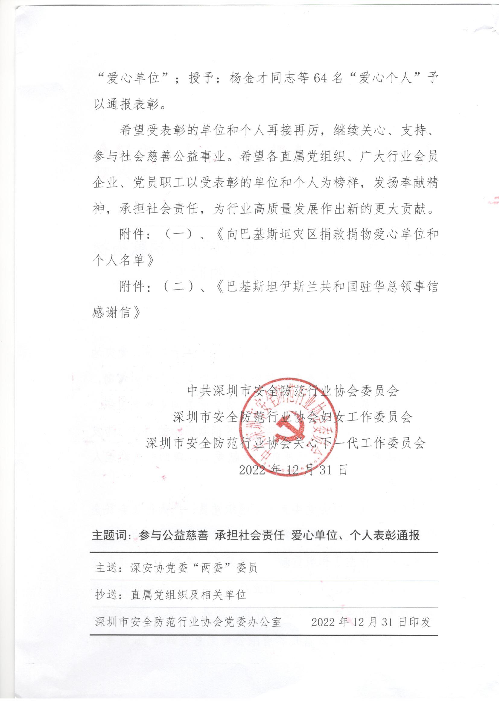 深圳市宇航光通科技有限公司:慈始于心,善踐于行;博愛長駐,人道永恒。感謝貴單位積極響應號召,向巴基斯坦災區人民奉獻愛心,凝聚起堅不可摧的強大正能量。謹向貴單位致以最誠摯的感謝和最崇高的敬意!
