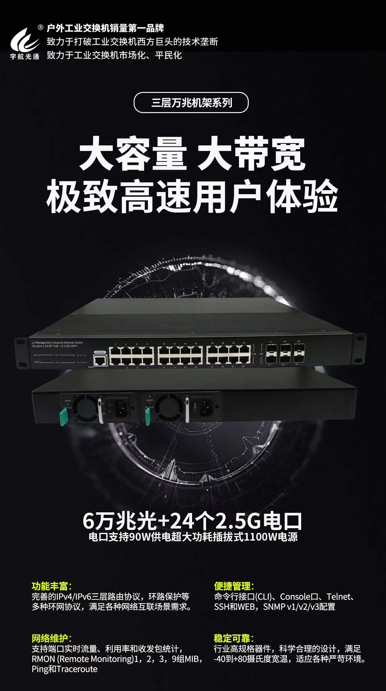 宇航6萬兆+24個2.5G電口工業(yè)交換機(jī)單個端口BT-90W-POE供電,雙電源1100W超大功率,高帶寬、穩(wěn)定可靠、功能豐富、電源冗余、網(wǎng)絡(luò)維護(hù)以及便捷管理等特點,為用戶提供了極致的高速體驗和可靠的網(wǎng)絡(luò)連接。它具有6個10G上行主干光口和24個2.5G電口,可以滿足大規(guī)模數(shù)據(jù)傳輸?shù)男枨蟆P袠I(yè)高規(guī)格器件和科學(xué)合理的設(shè)計,使其能夠適應(yīng)各種嚴(yán)苛的環(huán)境,確保設(shè)備在各種條件下都能穩(wěn)定運(yùn)行。雙電源模塊,支持AC/DC多種供電方式。支持端口實時流量、利用率和收發(fā)包統(tǒng)計等網(wǎng)絡(luò)維護(hù)功能,更好地監(jiān)控和管理網(wǎng)絡(luò)。