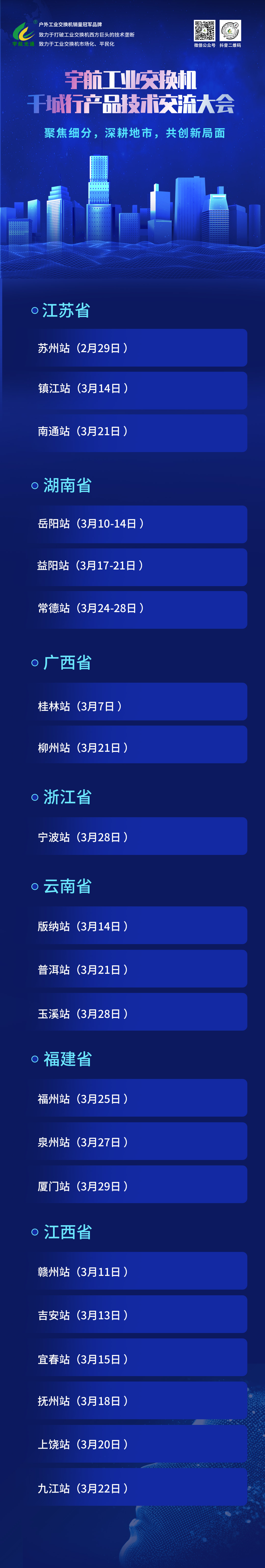三月,宇航將攜手眾多合作伙伴和宇航全國產工業交換機,在濟南、西安、鄭州、合肥、武漢等地參展,與各界朋友共襄盛舉。同時,宇航還將深入江蘇、湖南、廣西、浙江、云南、福建、江西等地,舉行宇航工業交換機千城行產品技術交流大會,助力各行各業的數字化轉型,讓數字化轉型的春風,吹滿神州大地!