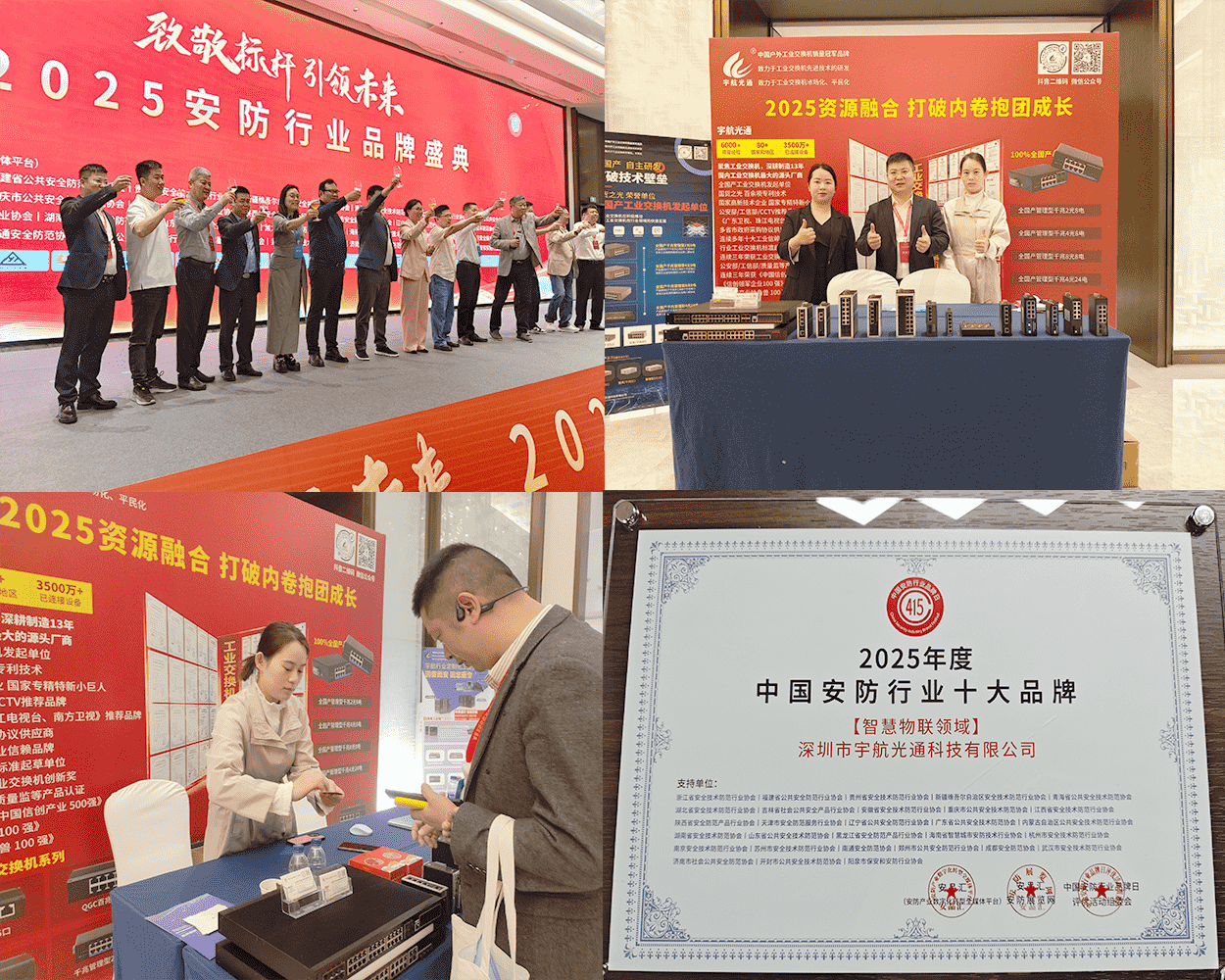 在杭州君尚云酈酒店舉辦的2025信創產品千城行技術交流大會期間,宇航工業交換機聯席總經理劉偉成應邀出席了同期舉行的2025中國安防行業品牌盛典。會上,劉總代表公司榮膺"2025年度中國安防行業優秀解決方案服務商"和"2025安防行業十大品牌"雙項殊榮。這些權威認可不僅是對宇航工業交換機產品實力與服務品質的高度肯定,也進一步彰顯了宇航科技在安防領域的專業影響力和市場地位,標志著宇航品牌已成為國產工業通信設備在安防行業的領軍力量。
