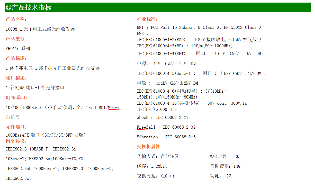 1路千兆電口+1路千兆FX光口工業(yè)級(jí)以太網(wǎng)交換機(jī),支持1個(gè)10Base-T/100Base-T/1000Base-TX電口和1個(gè)1000Base-X光口。產(chǎn)品符合FCC、CE、ROHS標(biāo)準(zhǔn)。YH300-11G系列交換機(jī)具有-40℃~85℃的工作溫度,具有超強(qiáng)的堅(jiān)固度能適應(yīng)各種嚴(yán)苛環(huán)境,也可以非常方便的安置在空間緊湊的控制箱中。導(dǎo)軌的安裝特性、寬溫操作及擁有IP40防護(hù)等級(jí)的外殼及LED指示燈,使YH300-11G成為一個(gè)即插即用的工業(yè)級(jí)設(shè)備,為用戶的以太網(wǎng)設(shè)備聯(lián)網(wǎng)提供可靠、便捷的解決方案。