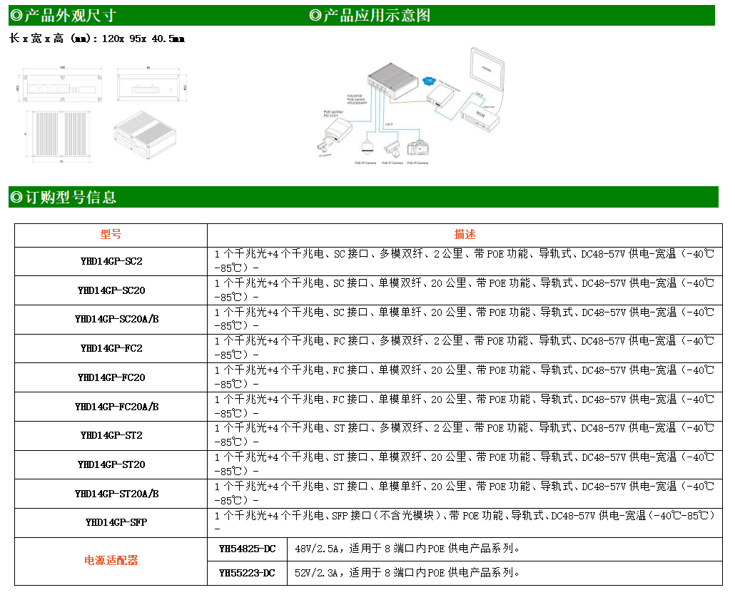 4路千兆POE電口+1路千兆FX光口工業級以太網POE交換機,支持4個10/100/1000Base-TX電口和1個1000Base-X光口。產品符合FCC、CE、ROHS標準。YH300-14GP系列交換機具有-40℃~85℃的工作溫度,具有超強的堅固度能適應各種嚴苛環境,也可以非常方便的安置在空間緊湊的控制箱中。導軌的安裝特性、寬溫操作及擁有IP40防護等級的外殼及LED指示燈,使YH300-14GP成為一個即插即用的工業級設備,為用戶的以太網設備聯網提供可靠、便捷的解決方案。