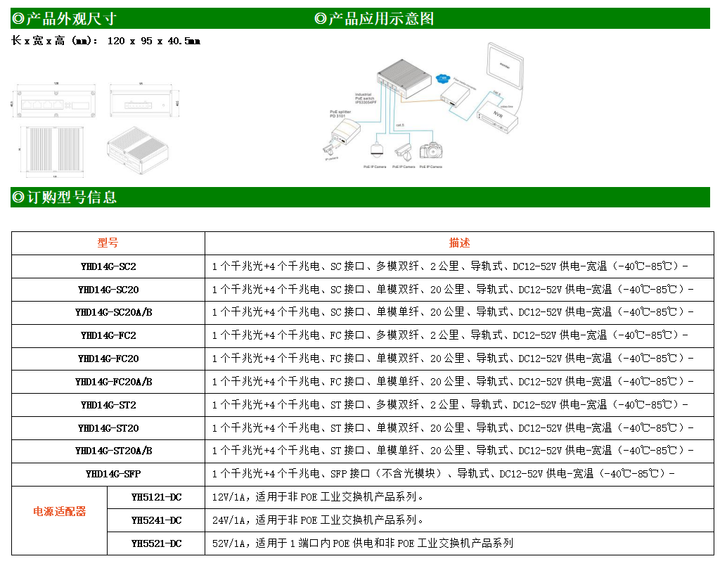 4路千兆電口+1路千兆FX光口工業級以太網交換機,支持4個100Base-T/1000Base-TX電口和1個1000Base-X光口。產品符合FCC、CE、ROHS標準。YH300-14G系列交換機具有-40℃~85℃的工作溫度,具有超強的堅固度能適應各種嚴苛環境,也可以非常方便的安置在空間緊湊的控制箱中。導軌的安裝特性、寬溫操作及擁有IP40防護等級的外殼及LED指示燈,使YH300-14G系列成為一個即插即用的工業級設備,為用戶的以太網設備聯網提供可靠、便捷的解決方案。