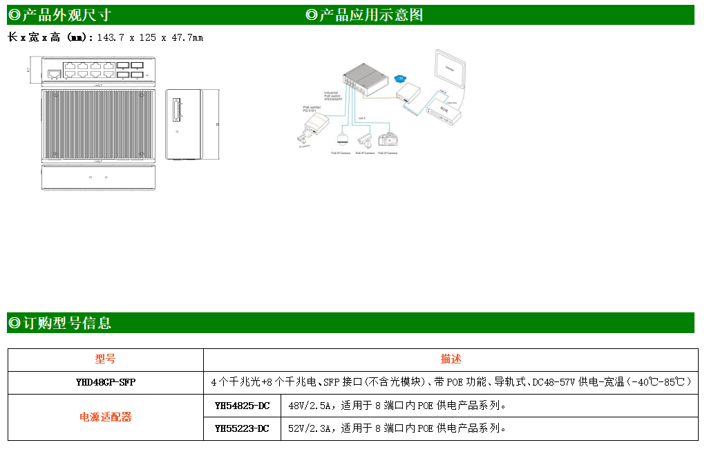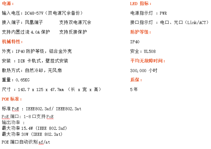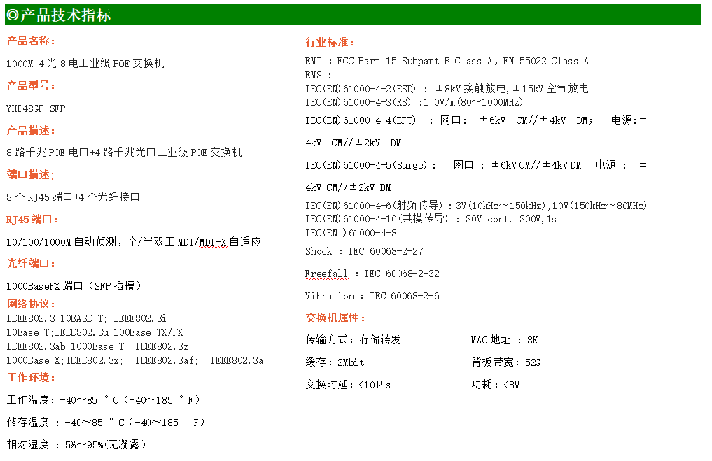 8路千兆POE電口+4路千兆FX光口工業(yè)級(jí)以太網(wǎng)POE交換機(jī),支持8個(gè)10/100/1000Base-TX電口和4個(gè)1000Base-X光口。產(chǎn)品符合FCC、CE、ROHS標(biāo)準(zhǔn)。YH300-48GP-SFP交換機(jī)具有-40℃~85℃的工作溫度,具有超強(qiáng)的堅(jiān)固度能適應(yīng)各種嚴(yán)苛環(huán)境,也可以非常方便的安置在空間緊湊的控制箱中。導(dǎo)軌的安裝特性、寬溫操作及擁有IP40防護(hù)等級(jí)的外殼及LED指示燈,使YH300-48GP-SFP成為一個(gè)即插即用的工業(yè)級(jí)設(shè)備,為用戶的以太網(wǎng)設(shè)備聯(lián)網(wǎng)提供可靠、便捷的解決方案。