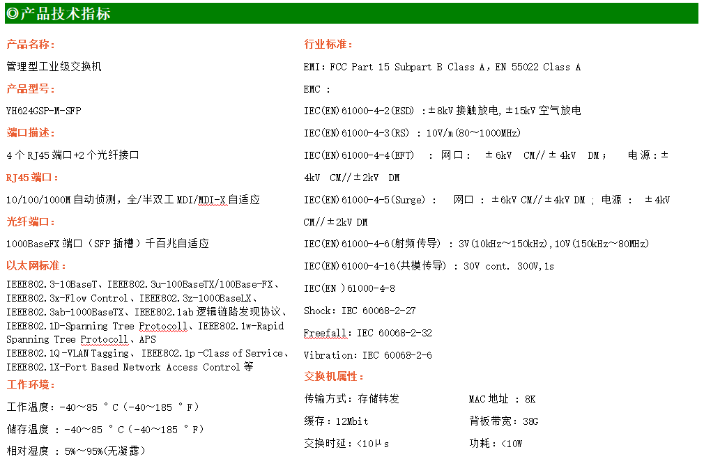 YH600-24GSP-M-SFP是網管型工業以太網POE交換機,產品符合FCC、CE、RoHS標準。支持2個千兆光口和4個千兆電口;支持工業現場所需的以太網二層協議,保證通信網絡的穩定性;該系列交換機采用低功耗、無風扇設計,確保無噪聲干擾,同時支持-40~85℃工作溫度和良好的EMC電磁兼容性能,保證在惡劣的工業環境中保持穩定的工作,為工廠自動化,智能交通,視頻監控等工業應用領域組建快速穩定的網絡終端接入網絡提供安全可靠的解決方案。