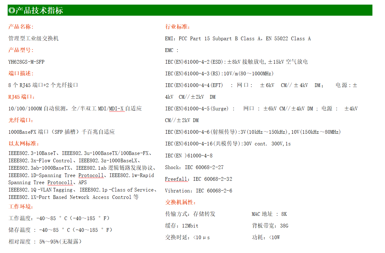YHH600-28GS-M-SFP是網(wǎng)管型工業(yè)以太網(wǎng)交換機,產(chǎn)品符合FCC、CE、RoHS標準。支持2個千兆光口和8個千兆電口;支持工業(yè)現(xiàn)場所需的以太網(wǎng)二層協(xié)議,保證通信網(wǎng)絡(luò)的穩(wěn)定性;該系列交換機采用低功耗、無風(fēng)扇設(shè)計,確保無噪聲干擾,同時支持-40~85℃工作溫度和良好的EMC電磁兼容性能,保證在惡劣的工業(yè)環(huán)境中保持穩(wěn)定的工作,為工廠自動化,智能交通,視頻監(jiān)控等工業(yè)應(yīng)用領(lǐng)域組建快速穩(wěn)定的網(wǎng)絡(luò)終端接入網(wǎng)絡(luò)提供安全可靠的解決方案。