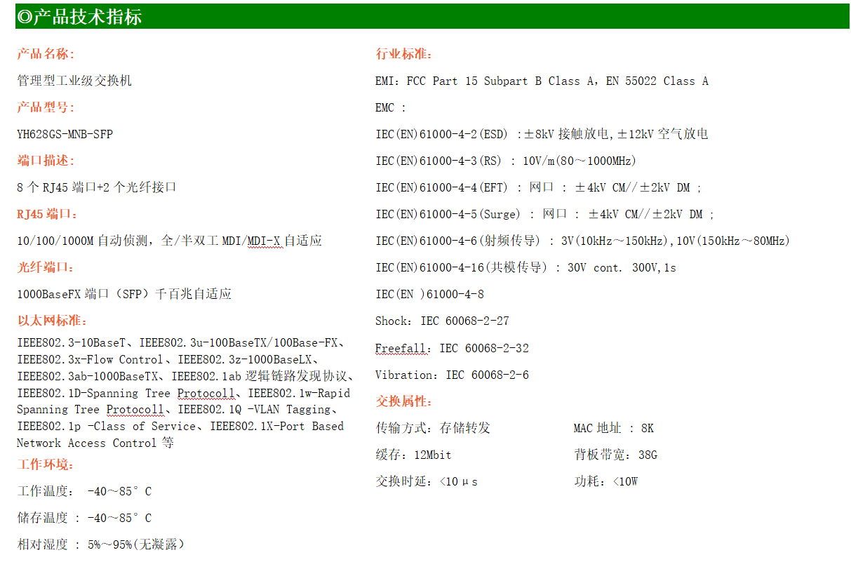 YHH600-28GS-MNB-SFP是網(wǎng)管型工業(yè)以太網(wǎng)交換機(jī),產(chǎn)品符合FCC、CE、RoHS標(biāo)準(zhǔn)。支持2個千兆光口和8個千兆電口;支持工業(yè)現(xiàn)場所需的以太網(wǎng)二層協(xié)議,保證通信網(wǎng)絡(luò)的穩(wěn)定性;該系列交換機(jī)采用低功耗、無風(fēng)扇設(shè)計,確保無噪聲干擾,同時支持-40~85℃工作溫度和良好的EMC電磁兼容性能,保證在惡劣的工業(yè)環(huán)境中保持穩(wěn)定的工作,為工廠自動化,智能交通,視頻監(jiān)控等工業(yè)應(yīng)用領(lǐng)域組建快速穩(wěn)定的網(wǎng)絡(luò)終端接入網(wǎng)絡(luò)提供安全可靠的解決方案。