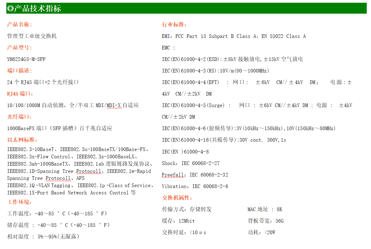 YH600-224GS-M-SFP是網管型工業以太網交換機,產品符合FCC、CE、RoHS標準。支持2個千兆光口和24個千兆電口;支持工業現場所需的以太網二層協議,保證通信網絡的穩定性;該系列交換機采用低功耗、無風扇設計,確保無噪聲干擾,同時支持-40~85℃工作溫度和良好的EMC電磁兼容性能,保證在惡劣的工業環境中保持穩定的工作,為工廠自動化,智能交通,視頻監控等工業應用領域組建快速穩定的網絡終端接入網絡提供安全可靠的解決方案。