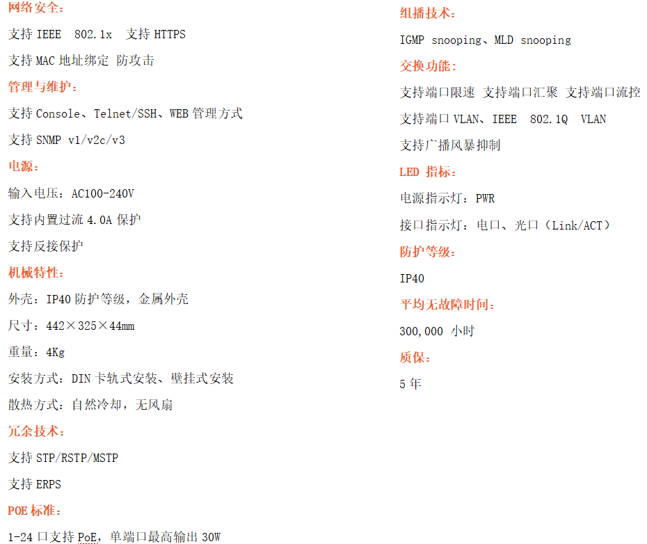●安全管理:支持ACL訪問控制列表,支持802.1X