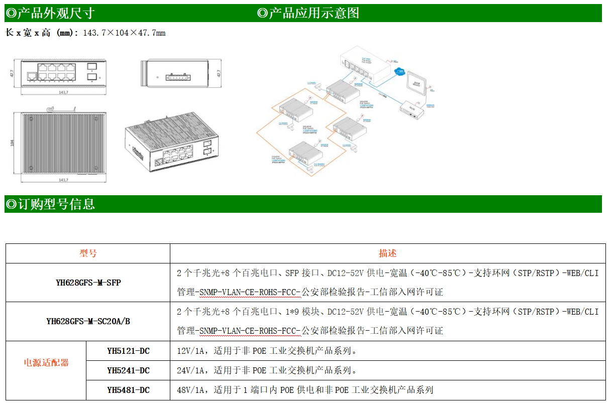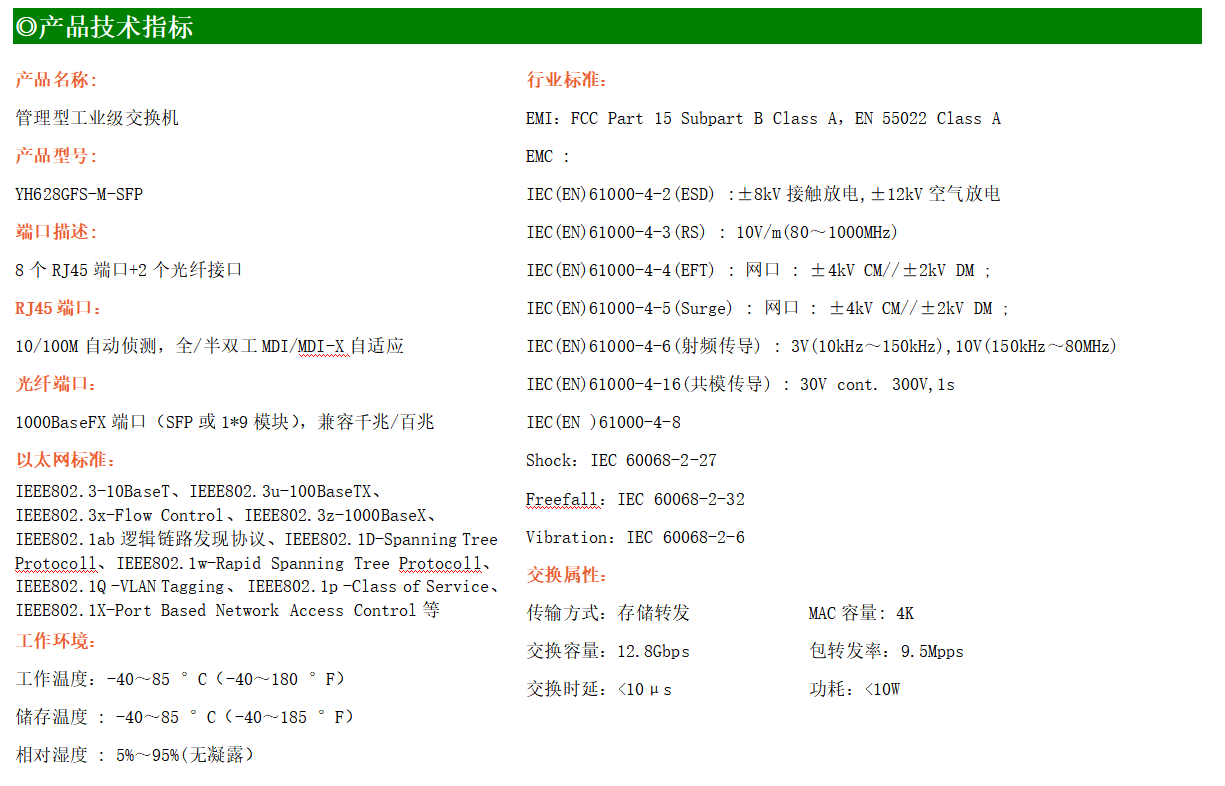 YH500-28GFS-M是網(wǎng)管型工業(yè)以太網(wǎng)交換機(jī),產(chǎn)品符合FCC、CE、RoHS標(biāo)準(zhǔn)。支持2個(gè)千兆光口和8個(gè)百兆電口;支持工業(yè)現(xiàn)場(chǎng)所需的以太網(wǎng)二層協(xié)議,保證通信網(wǎng)絡(luò)的穩(wěn)定性;該系列交換機(jī)采用低功耗、無(wú)風(fēng)扇設(shè)計(jì),確保無(wú)噪聲干擾,同時(shí)支持-40~85℃工作溫度和良好的EMC電磁兼容性能,保證在惡劣的工業(yè)環(huán)境中保持穩(wěn)定的工作,為工廠自動(dòng)化,智能交通,視頻監(jiān)控等工業(yè)應(yīng)用領(lǐng)域組建快速穩(wěn)定的網(wǎng)絡(luò)終端接入網(wǎng)絡(luò)提供安全可靠的解決方案。