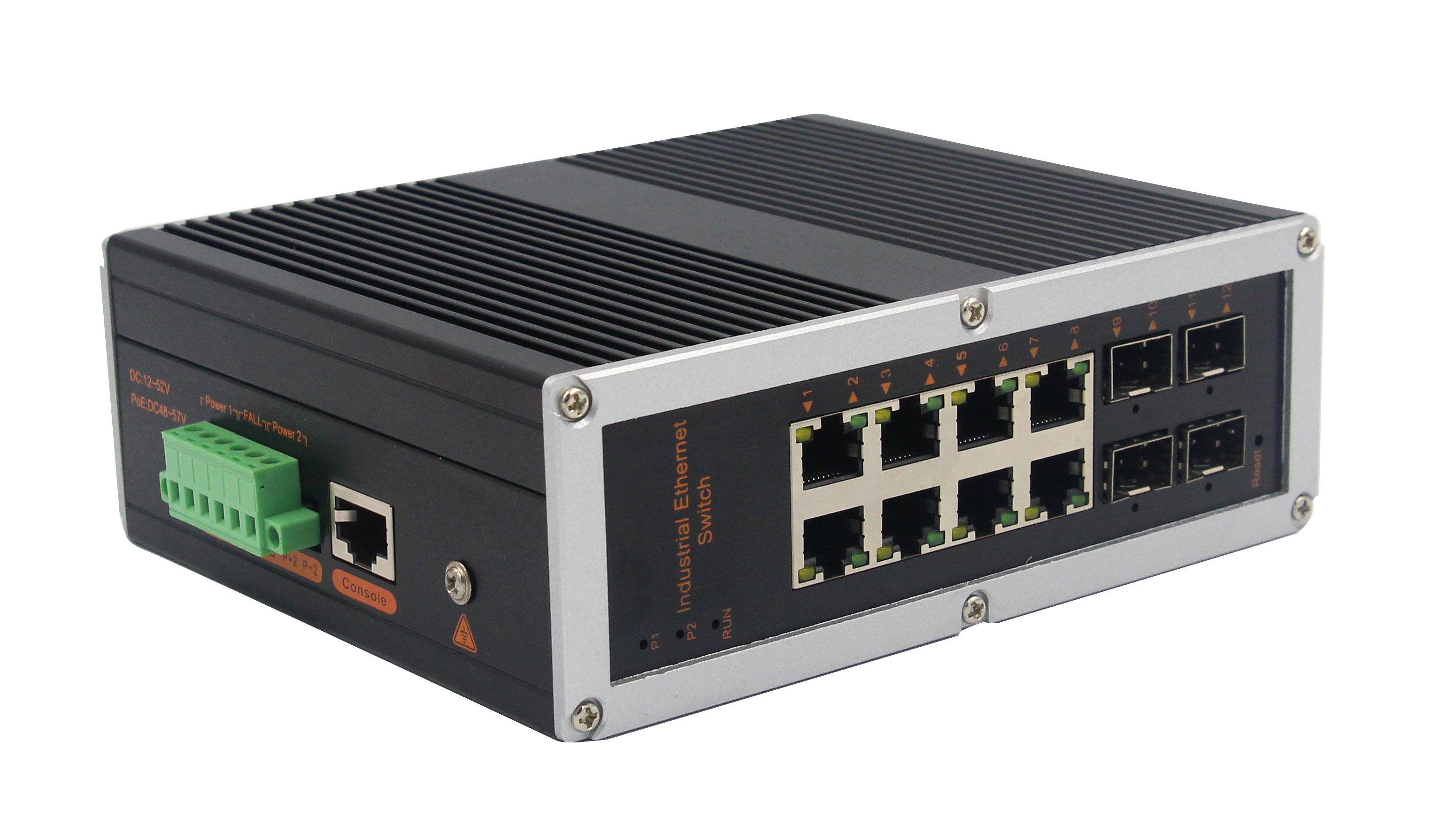 4個(gè)千兆光+8個(gè)千兆電、SFP接口(不含光模塊)、導(dǎo)軌式、DC12-52V供電 |