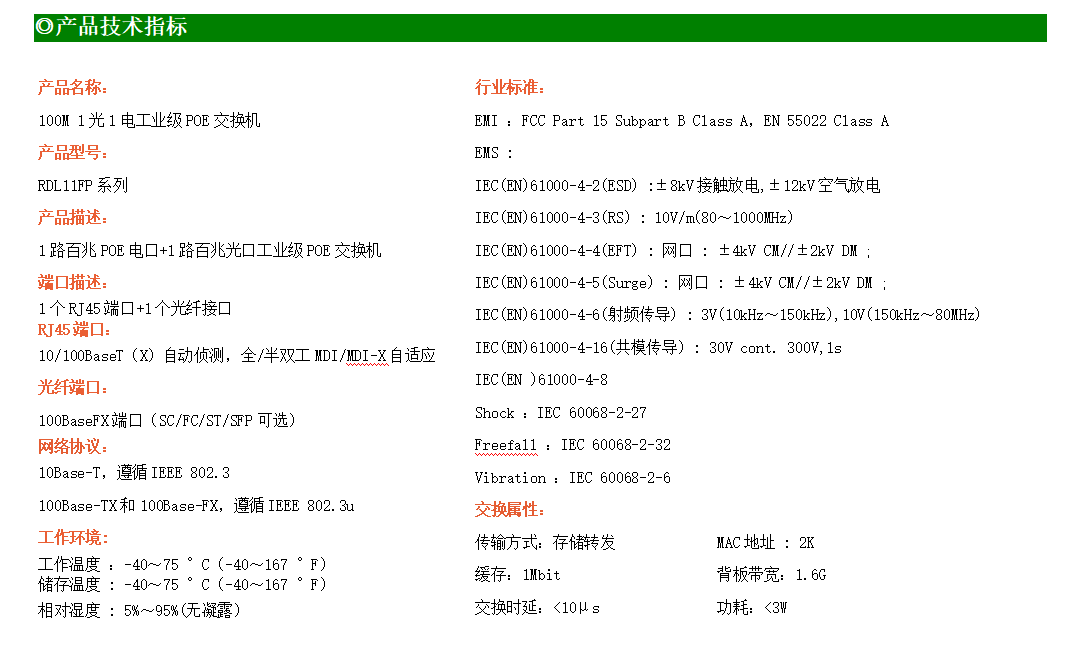 1路百兆POE電口+1路百兆光口工業(yè)級以太網(wǎng)POE交換機,支持1個10/100Base-TX電口和1個100Base-X(SC/ST/FC)光口。產(chǎn)品符合FCC、CE、ROHS標準。RDL11FP系列交換機具有-40℃~75℃的工作溫度,具有超強的堅固度能適應(yīng)各種嚴苛環(huán)境,也可以非常方便的安置在空間緊湊的控制箱中。導軌的安裝特性、寬溫操作及擁有IP40防護等級的外殼及LED指示燈,使RDL11FP成為一個即插即用的工業(yè)級設(shè)備,為用戶的以太網(wǎng)設(shè)備聯(lián)網(wǎng)提供可靠、便捷的解決方案。