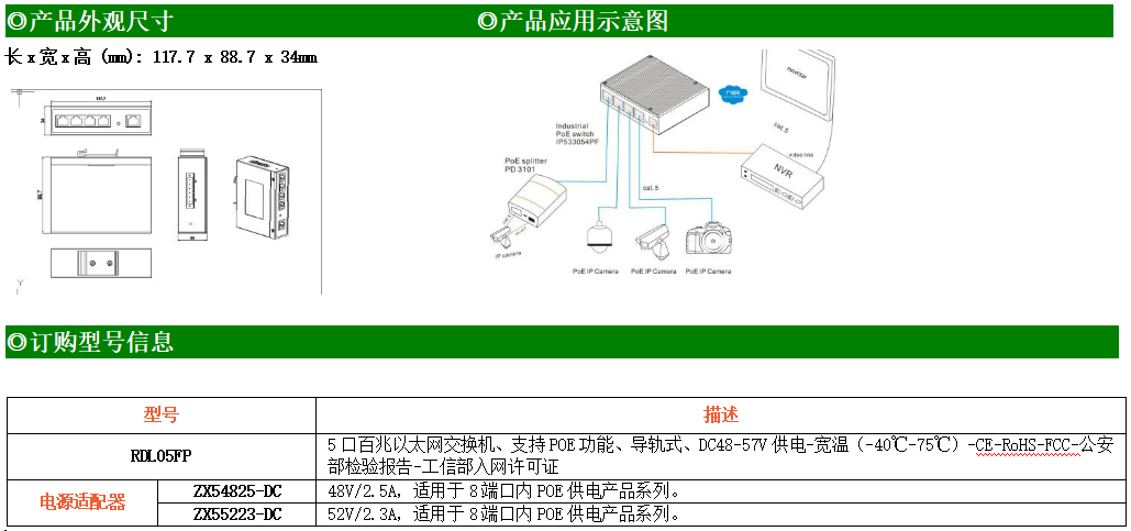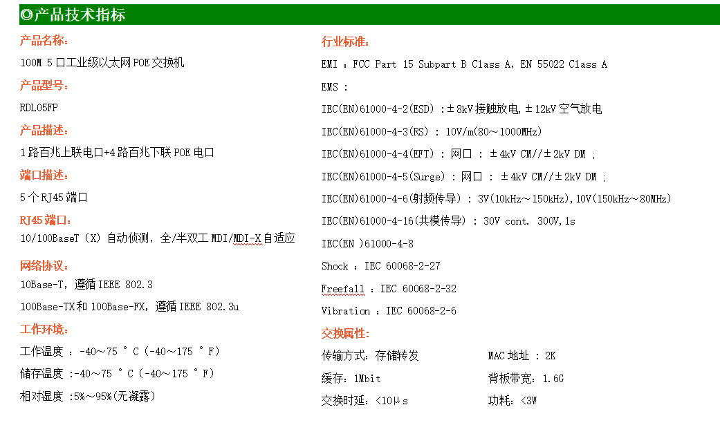 1路百兆上聯(lián)電口+4路百兆下聯(lián)電口工業(yè)級以太網(wǎng)POE交換機,支持1個10/100Base-TX上聯(lián)電口和4個10Base-T/100Base-TX下聯(lián)POE電口。產(chǎn)品符合FCC、CE、ROHS標準。RDL05F交換機具有-40℃~75℃的工作溫度,具有超強的堅固度能適應(yīng)各種嚴苛環(huán)境,也可以非常方便的安置在空間緊湊的控制箱中。導(dǎo)軌的安裝特性、寬溫操作及擁有IP40防護等級的外殼及LED指示燈,使RDL05FP成為一個即插即用的工業(yè)級設(shè)備,為用戶的以太網(wǎng)設(shè)備聯(lián)網(wǎng)提供可靠、便捷的解決方案。
