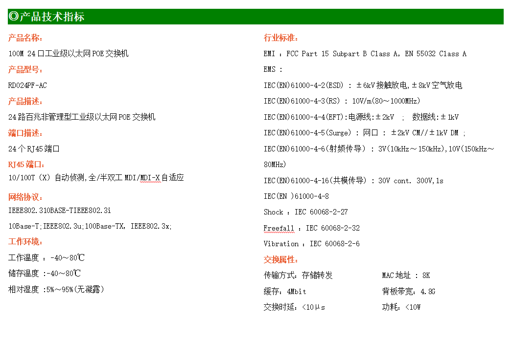 24路百兆電口工業(yè)級以太網(wǎng)交換機,支持24個10Base-T/100Base-TX電口。產(chǎn)品符合FCC、CE、ROHS標(biāo)準(zhǔn)。RD024F交換機具有-40℃~80℃的工作溫度,具有超強的堅固度能適應(yīng)各種嚴(yán)苛環(huán)境,也可以非常方便的安置在空間緊湊的控制箱中。導(dǎo)軌的安裝特性、寬溫操作及擁有IP40防護等級的外殼及LED指示燈,使RD024F成為一個即插即用的工業(yè)級設(shè)備,為用戶的以太網(wǎng)設(shè)備聯(lián)網(wǎng)提供可靠、便捷的解決方案。