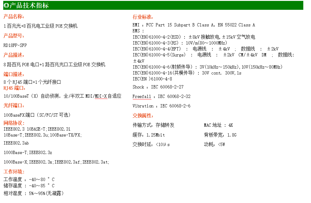 8路百兆電口+1路百兆FX光口工業級以太網交換機,支持8個10/100Base-TX電口和1個100Base-X光口。產品符合FCC、CE、ROHS標準。RD18F交換機具有-40℃~80℃的工作溫度,具有超強的堅固度能適應各種嚴苛環境,也可以非常方便的安置在空間緊湊的控制箱中。導軌的安裝特性、寬溫操作及擁有IP40防護等級的外殼及LED指示燈,使RD18F成為一個即插即用的工業級設備,為用戶的以太網設備聯網提供可靠、便捷的解決方案。