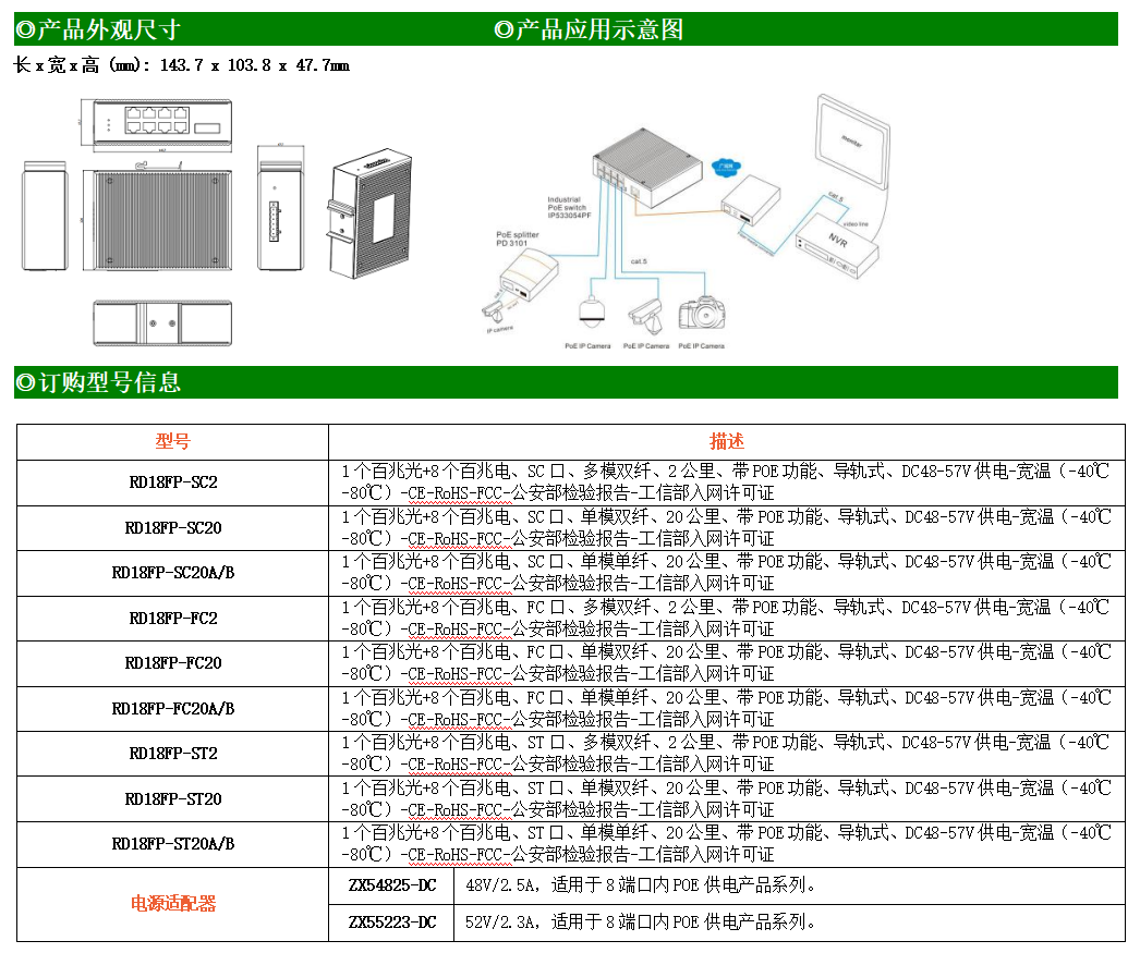 4路百兆POE電口+2路百兆FX光口工業級以太網交換機,支持4個10Base-T/100Base-TX電口和2個100Base-X光口。產品符合FCC、CE、ROHS標準。RD24FP系列交換機具有-40℃~80℃的工作溫度,具有超強的堅固度能適應各種嚴苛環境,也可以非常方便的安置在空間緊湊的控制箱中。導軌的安裝特性、寬溫操作及擁有IP40防護等級的外殼及LED指示燈,使RD24FP成為一個即插即用的工業級設備,為用戶的以太網設備聯網提供可靠、便捷的解決方案。