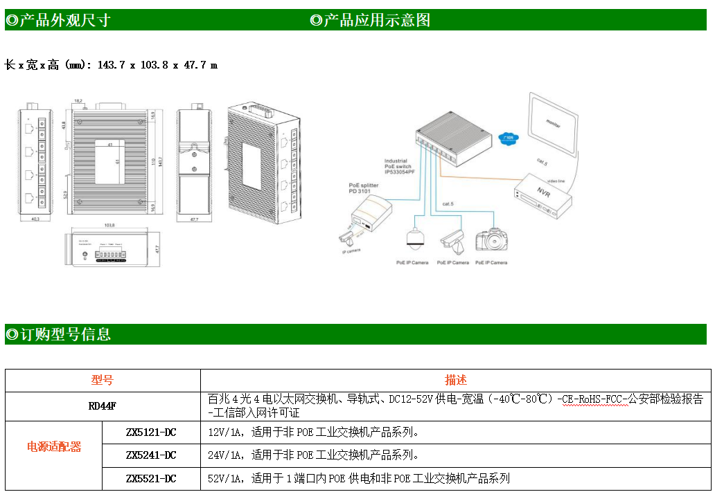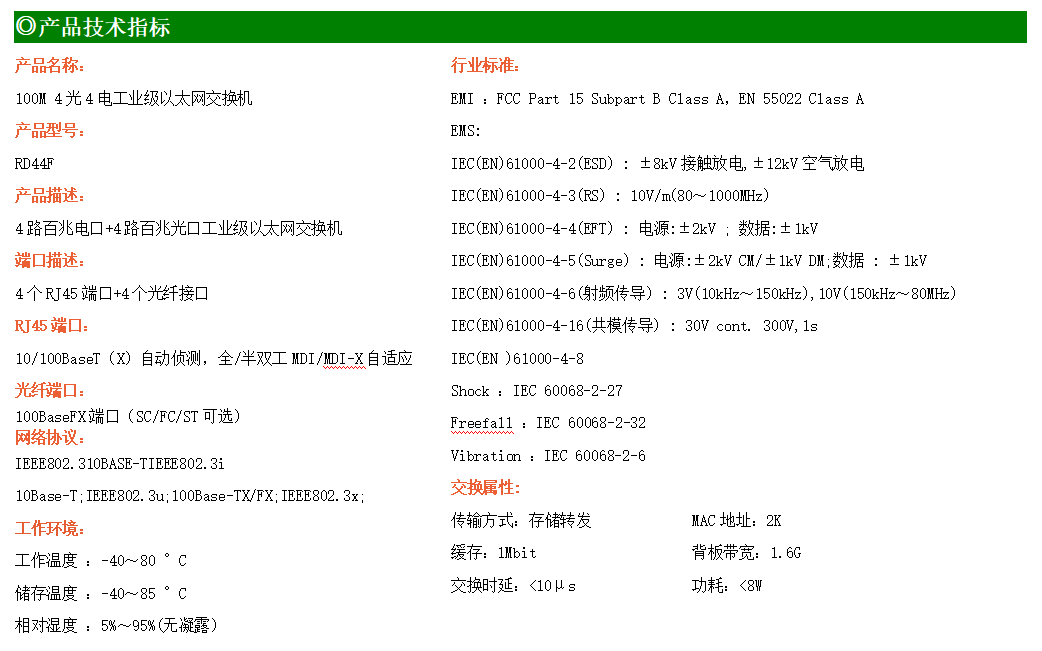 4路百兆電口+4路百兆光口工業(yè)級(jí)以太網(wǎng)交換機(jī),支持4個(gè)10Base-T/100Base-TX電口和4個(gè)100Base-FX(SC/FC/ST可選)光口。產(chǎn)品符合FCC、CE、ROHS標(biāo)準(zhǔn)。RD44F交換機(jī)具有-40℃~80℃的工作溫度,具有超強(qiáng)的堅(jiān)固度能適應(yīng)各種嚴(yán)苛環(huán)境,也可以非常方便的安置在空間緊湊的控制箱中。導(dǎo)軌的安裝特性、寬溫操作及擁有IP40防護(hù)等級(jí)的外殼及LED指示燈,使RD44F成為一個(gè)即插即用的工業(yè)級(jí)設(shè)備,為用戶的以太網(wǎng)設(shè)備聯(lián)網(wǎng)提供可靠、便捷的解決方案。