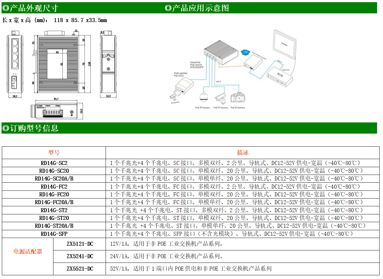 4路千兆POE電口+1路千兆FX光口工業級以太網POE交換機,支持4個10/100/1000Base-TX電口和1個1000Base-X光口。產品符合FCC、CE、ROHS標準。RD14GP系列交換機具有-40℃~80℃的工作溫度,具有超強的堅固度能適應各種嚴苛環境,也可以非常方便的安置在空間緊湊的控制箱中。導軌的安裝特性、寬溫操作及擁有IP40防護等級的外殼及LED指示燈,使RD14GP成為一個即插即用的工業級設備,為用戶的以太網設備聯網提供可靠、便捷的解決方案。