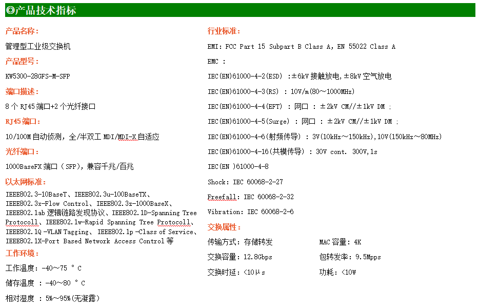KW5300-28GFS-M-SFP是網(wǎng)管型工業(yè)以太網(wǎng)交換機(jī),產(chǎn)品符合FCC、CE、RoHS標(biāo)準(zhǔn)。支持2個(gè)千兆光口和8個(gè)百兆電口;支持工業(yè)現(xiàn)場(chǎng)所需的以太網(wǎng)二層協(xié)議,保證通信網(wǎng)絡(luò)的穩(wěn)定性;該系列交換機(jī)采用低功耗、無風(fēng)扇設(shè)計(jì),確保無噪聲干擾,同時(shí)支持-40~75℃工作溫度和良好的EMC電磁兼容性能,保證在惡劣的工業(yè)環(huán)境中保持穩(wěn)定的工作,為工廠自動(dòng)化,智能交通,視頻監(jiān)控等工業(yè)應(yīng)用領(lǐng)域組建快速穩(wěn)定的網(wǎng)絡(luò)終端接入網(wǎng)絡(luò)提供安全可靠的解決方案。