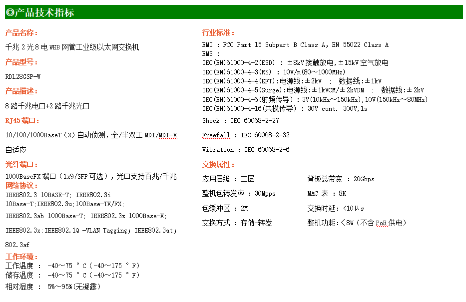 RDL28GS-W-SFP系列WEB網管工業級以太網交換機,產品符合FCC、CE、ROHS標準,支持工業現場所需的以太網二層協議,保證通信網絡的穩定性。該系列交換機采用低功耗、無風扇設計,確保無噪聲干擾,同時支持-40~75℃工作溫度和良好的EMC電磁兼容性能,保證在惡劣的工業環境中保持穩定的工作,為工廠自動化,智能交通,視頻監控等工業應用領域組建快速穩定的網絡終端接入網絡提供安全可靠的解決方案。