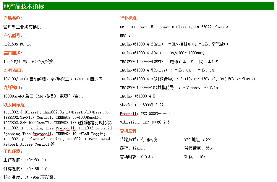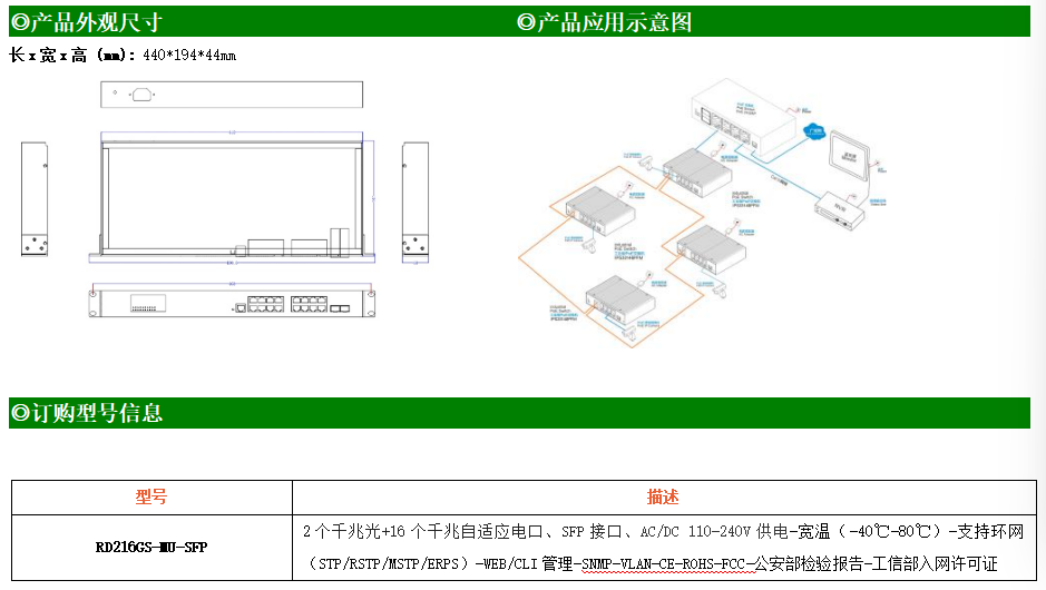 RD216GS-MU-SFP是網(wǎng)管型工業(yè)以太網(wǎng)交換機,產品符合FCC、CE、RoHS標準。支持2個千兆光口和16個千兆電口;支持工業(yè)現(xiàn)場所需的以太網(wǎng)二層協(xié)議,保證通信網(wǎng)絡的穩(wěn)定性;該系列交換機采用低功耗、無風扇設計,確保無噪聲干擾,同時支持-40~80℃工作溫度和良好的EMC電磁兼容性能,保證在惡劣的工業(yè)環(huán)境中保持穩(wěn)定的工作,為工廠自動化,智能交通,視頻監(jiān)控等工業(yè)應用領域組建快速穩(wěn)定的網(wǎng)絡終端接入網(wǎng)絡提供安全可靠的解決方案。