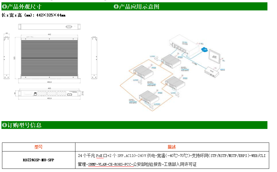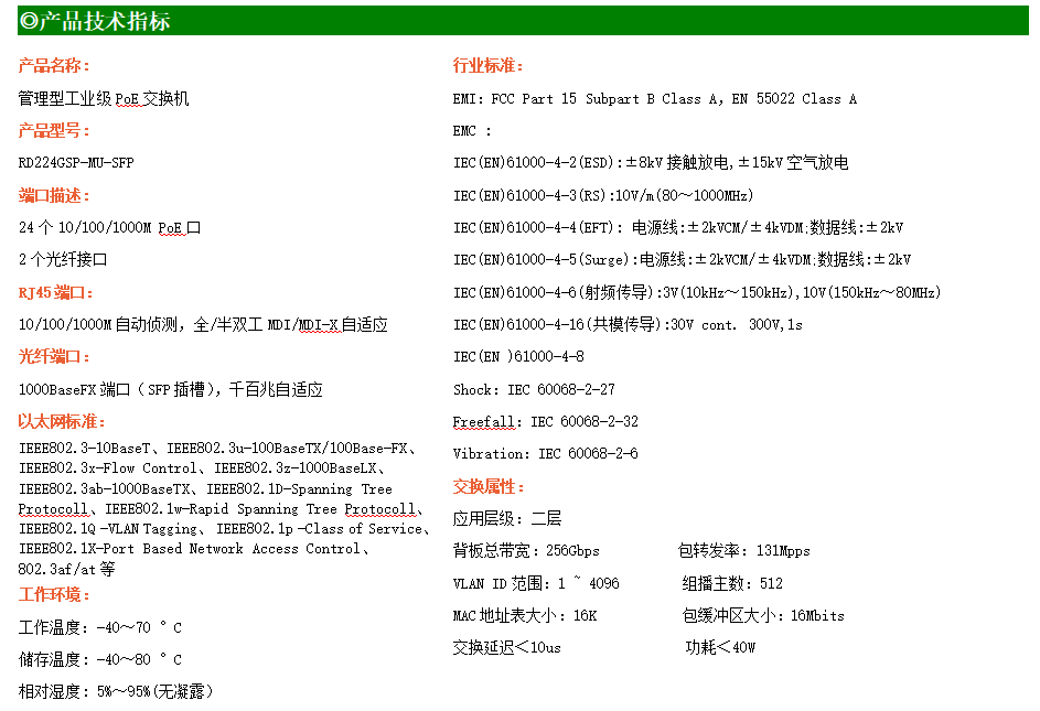 RD224GSP-MU-SFP是網(wǎng)管型工業(yè)以太網(wǎng)PoE交換機,產(chǎn)品符合FCC、CE、RoHS標準。可提供24個千兆PoE端口,所有PoE端口符合IEEE802.3af/at標準。支持工業(yè)現(xiàn)場所需的以太網(wǎng)二層協(xié)議,保證通信網(wǎng)絡的穩(wěn)定性;該系列交換機采用低功耗、無風扇設計,確保無噪聲干擾,同時支持-40~70℃工作溫度和良好的EMC電磁兼容性能,保證在惡劣的工業(yè)環(huán)境中保持穩(wěn)定的工作,為工廠自動化,智能交通,視頻監(jiān)控等工業(yè)應用領域組建快速穩(wěn)定的網(wǎng)絡終端接入網(wǎng)絡提供安全可靠的解決方案。