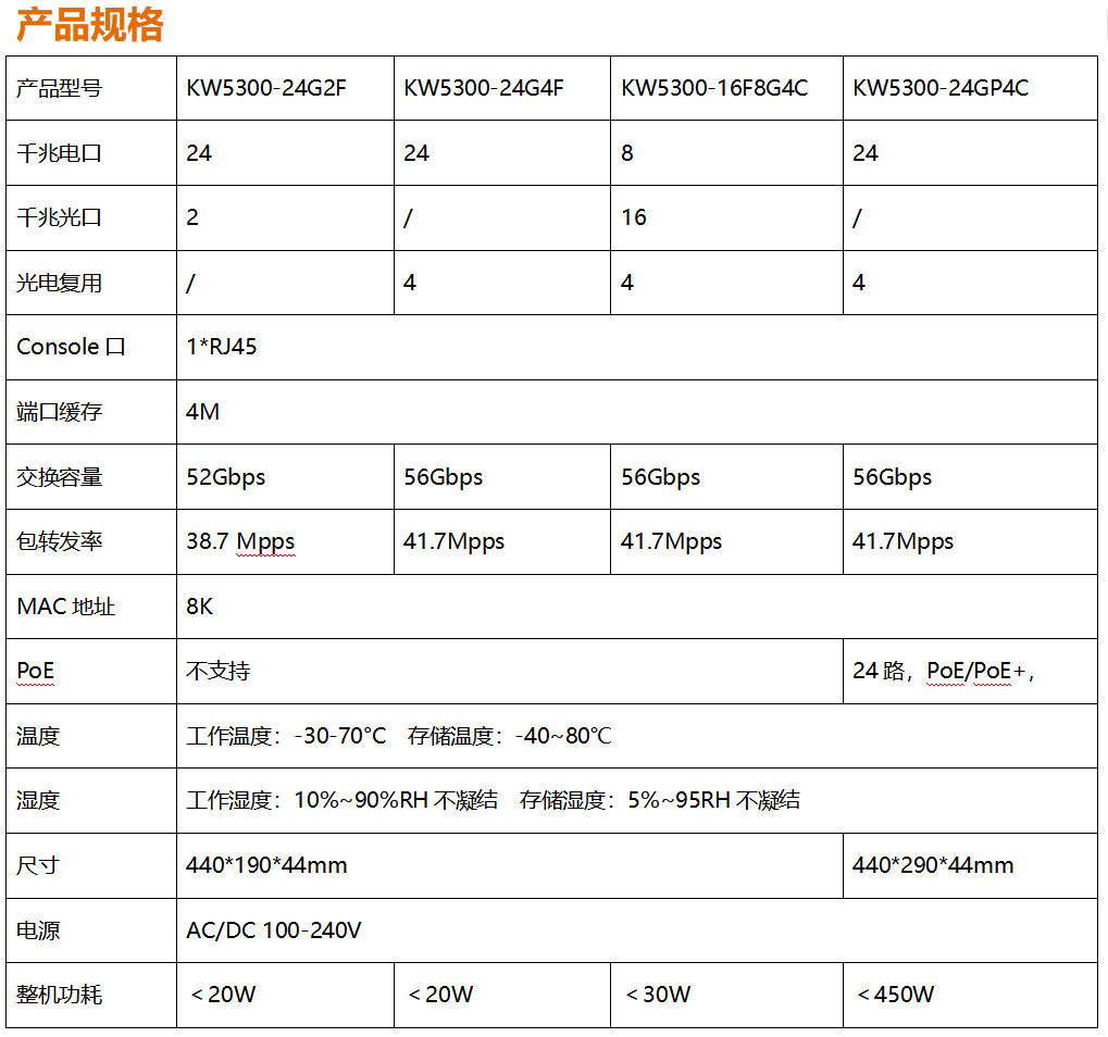 ?全新開發(fā)推出的KW5300系列全千兆網(wǎng)管寬溫交換機(jī),采用新一代高性能硬件和軟件平臺,提供靈活、高性價比的全千兆接入和上行端口,支持完備的安全防護(hù)機(jī)制、完善的ACL/QoS策略和靈活的VLAN功能,易于管理維護(hù),滿足用戶對于網(wǎng)絡(luò)設(shè)備易管理、高安全、高性能、低成本的組網(wǎng)需求,專為市政、銀行、教育、醫(yī)院、酒店、網(wǎng)吧、數(shù)據(jù)中心等室內(nèi)項(xiàng)目以及戶外新基建項(xiàng)目定制系列,能滿足大規(guī)模的市場需求。