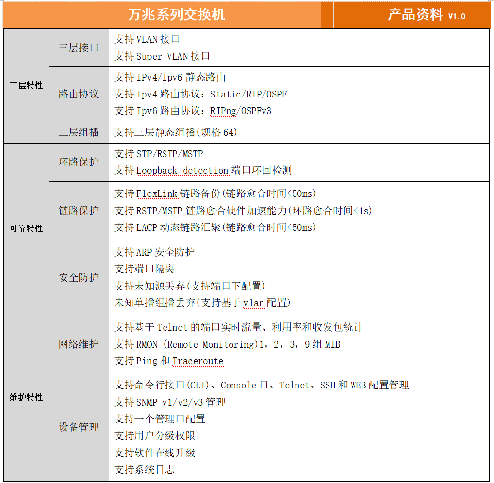 整機設備提供大容量、高密度、模塊化的二/三層線速轉發性能,豐富的業務功能、強大的QoS 保障和完善的安全管理機制,具有電信級的可靠性設計,可以提供電源部件的冗余,保證網絡核心的穩定和關鍵業務的可靠運行;具有880G的交換容量,支持所有端口線速轉發。