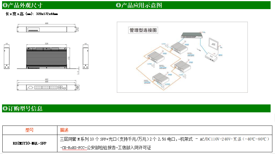 RD2MST10-MQL-SFP交換機是我司推出的一款萬兆三層交換機,配備10個萬兆SFP+光口和2個10/100/1000/2500M自適應(yīng)電口,具備先進(jìn)的硬件處理能力和最豐富的業(yè)務(wù)特性。支持IPv4/IPv6 硬件雙棧及線速轉(zhuǎn)發(fā),使客戶能夠從容應(yīng)對即將帶來的IPv6 時代其提供高容量的交換能力。RD2MST10-MQL-SFP交換機具有-40℃~80℃的工作溫度,具有超強的堅固度能適應(yīng)各種嚴(yán)苛環(huán)境。導(dǎo)軌式安裝特性、寬溫操作,使RD2MST10-MQL-SFP的交換機成為一個即插即用的工業(yè)級設(shè)備,為用戶的以太網(wǎng)設(shè)備聯(lián)網(wǎng)提供可靠、便捷的解決方案。