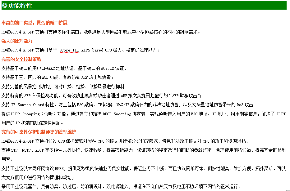 ●網絡冗余:支持STP/RSTP/MSTP,支持ERPS(自愈時間<20ms)