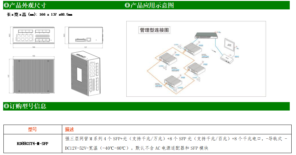 RD88GST4-M-SFP交換機是我司推出的一款萬兆三層交換機,配備4個萬兆SFP+光口、8個千兆SFP光口和8個10/100/1000M Base-T自適應電口,具備先進的硬件處理能力和最豐富的業務特性。支持IPv4/IPv6 硬件雙棧及線速轉發,使客戶能夠從容應對即將帶來的IPv6 時代其提供高容量的交換能力。RD88GST4-M-SFP交換機具有-40℃~80℃的工作溫度,具有超強的堅固度能適應各種嚴苛環境。導軌式安裝特性、寬溫操作,使RD48GST4-M-SFP的交換機成為一個即插即用的工業級設備,為用戶的以太網設備聯網提供可靠、便捷的解決方案。
