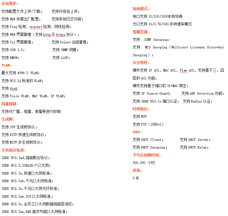 ●網(wǎng)絡(luò)冗余:支持STP/RSTP/MSTP,支持ERPS(自愈時間<20ms)
