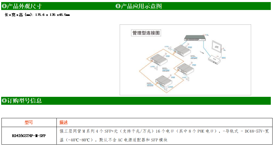 RD416GST4P-M-SFP交換機是我司推出的一款萬兆三層POE交換機,配備4個萬兆SFP+光口+8個10/100/1000M Base-T自適應(yīng)電口+8個10/100/1000M Base-T自適應(yīng)POE電口,具備先進的硬件處理能力和最豐富的業(yè)務(wù)特性。支持IPv4/IPv6 硬件雙棧及線速轉(zhuǎn)發(fā),使客戶能夠從容應(yīng)對即將帶來的IPv6 時代其提供高容量的交換能力。RD416GST4P-M-SFP交換機具有-40℃~80℃的工作溫度,具有超強的堅固度能適應(yīng)各種嚴苛環(huán)境。導(dǎo)軌式安裝特性、寬溫操作,使RD416GST4P-M-SFP的交換機成為一個即插即用的工業(yè)級設(shè)備,為用戶的以太網(wǎng)設(shè)備聯(lián)網(wǎng)提供可靠、便捷的解決方案。