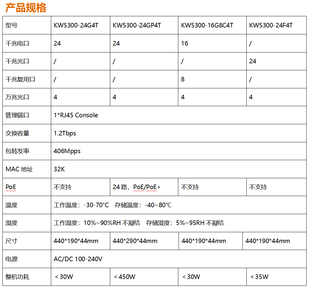 全新開發(fā)推出的KW5300系列全千兆網(wǎng)管寬溫交換機(jī),采用新一代高性能硬件和軟件平臺(tái),提供靈活、高性價(jià)比的全千兆接入和上行端口,支持完備的安全防護(hù)機(jī)制、完善的ACL/QoS策略和靈活的VLAN功能,易于管理維護(hù),滿足用戶對(duì)于網(wǎng)絡(luò)設(shè)備易管理、高安全、高性能、低成本的組網(wǎng)需求,專為市政、銀行、教育、醫(yī)院、酒店、網(wǎng)吧、數(shù)據(jù)中心等室內(nèi)項(xiàng)目以及戶外新基建項(xiàng)目定制系列,能滿足大規(guī)模的市場(chǎng)需求。