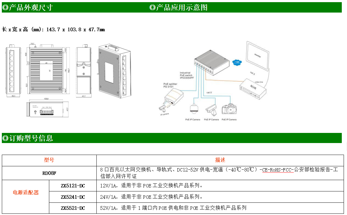 8路百兆電口工業(yè)級(jí)以太網(wǎng)交換機(jī),支持8個(gè)10Base-T/100Base-TX電口。產(chǎn)品符合FCC、CE、ROHS標(biāo)準(zhǔn)。RD08F交換機(jī)具有-40℃~80℃的工作溫度,具有超強(qiáng)的堅(jiān)固度能適應(yīng)各種嚴(yán)苛環(huán)境,也可以非常方便的安置在空間緊湊的控制箱中。導(dǎo)軌的安裝特性、寬溫操作及擁有IP40防護(hù)等級(jí)的外殼及LED指示燈,使RD08F成為一個(gè)即插即用的工業(yè)級(jí)設(shè)備,為用戶的以太網(wǎng)設(shè)備聯(lián)網(wǎng)提供可靠、便捷的解決方案。
