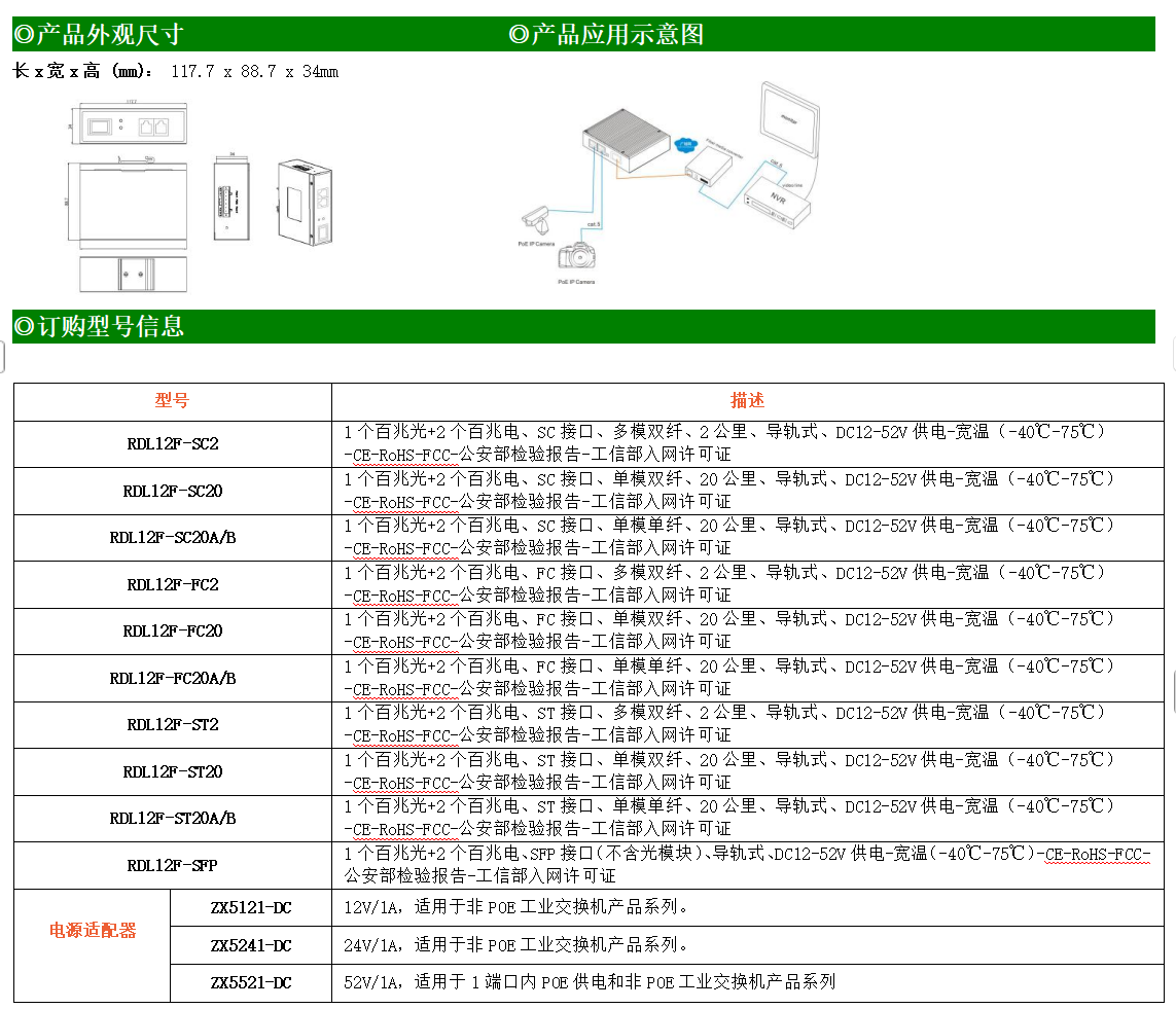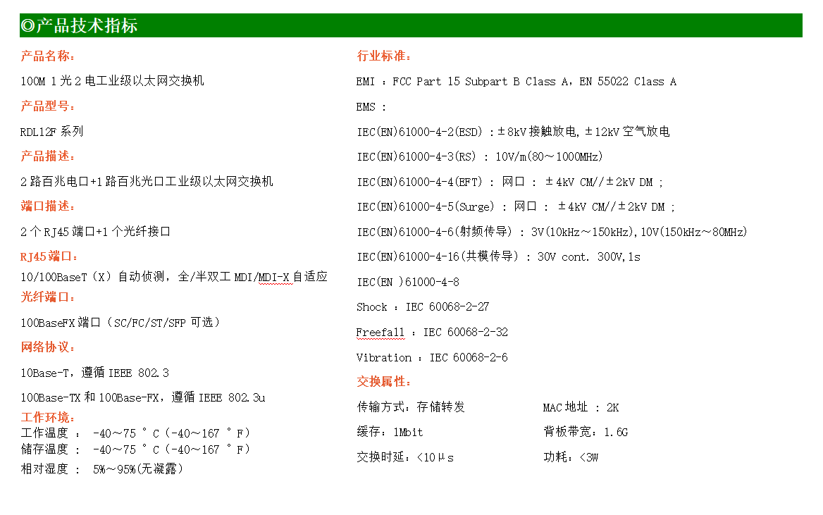 2路百兆電口+1路百兆FX光口工業(yè)級以太網(wǎng)交換機,支持2個10Base-T/100Base-TX電口和1個100Base-X光口。產(chǎn)品符合FCC、CE、ROHS標準。RDL12F系列交換機具有-40℃~75℃的工作溫度,具有超強的堅固度能適應各種嚴苛環(huán)境,也可以非常方便的安置在空間緊湊的控制箱中。導軌的安裝特性、寬溫操作及擁有IP40防護等級的外殼及LED指示燈,使RDL12F成為一個即插即用的工業(yè)級設備,為用戶的以太網(wǎng)設備聯(lián)網(wǎng)提供可靠、便捷的解決方案。