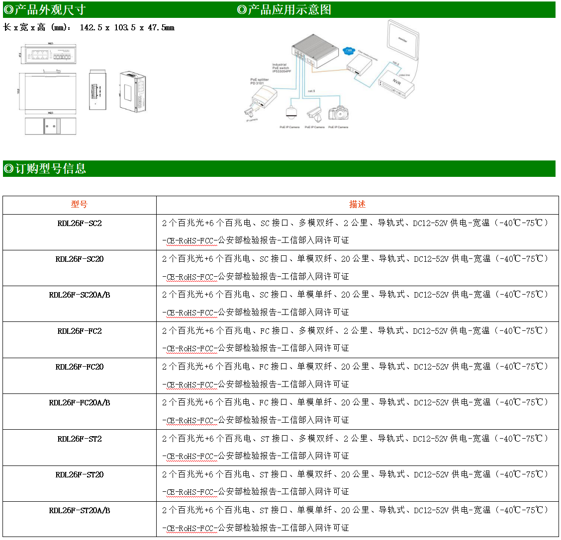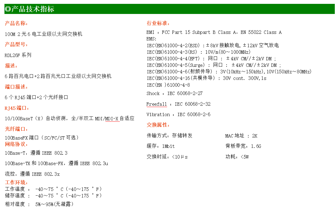 6路百兆電口+2路百兆FX光口工業(yè)級以太網(wǎng)交換機(jī),支持6個10Base-T/100Base-TX電口和2個100Base-X光口。產(chǎn)品符合FCC、CE、ROHS標(biāo)準(zhǔn)。RDL26F系列交換機(jī)具有-40℃~75℃的工作溫度,具有超強的堅固度能適應(yīng)各種嚴(yán)苛環(huán)境,也可以非常方便的安置在空間緊湊的控制箱中。導(dǎo)軌的安裝特性、寬溫操作及擁有IP40防護(hù)等級的外殼及LED指示燈,使RDL26F成為一個即插即用的工業(yè)級設(shè)備,為用戶的以太網(wǎng)設(shè)備聯(lián)網(wǎng)提供可靠、便捷的解決方案。