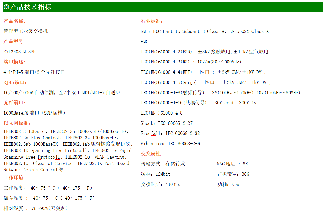 ZXL24GS-M是網(wǎng)管型工業(yè)以太網(wǎng)交換機,產(chǎn)品符合FCC、CE、RoHS標準。支持2個千兆光口和4個千兆電口;支持工業(yè)現(xiàn)場所需的以太網(wǎng)二層協(xié)議,保證通信網(wǎng)絡(luò)的穩(wěn)定性;該系列交換機采用低功耗、無風扇設(shè)計,確保無噪聲干擾,同時支持-40~75℃工作溫度和良好的EMC電磁兼容性能,保證在惡劣的工業(yè)環(huán)境中保持穩(wěn)定的工作,為工廠自動化,智能交通,視頻監(jiān)控等工業(yè)應(yīng)用領(lǐng)域組建快速穩(wěn)定的網(wǎng)絡(luò)終端接入網(wǎng)絡(luò)提供安全可靠的解決方案。