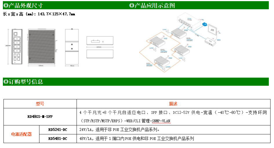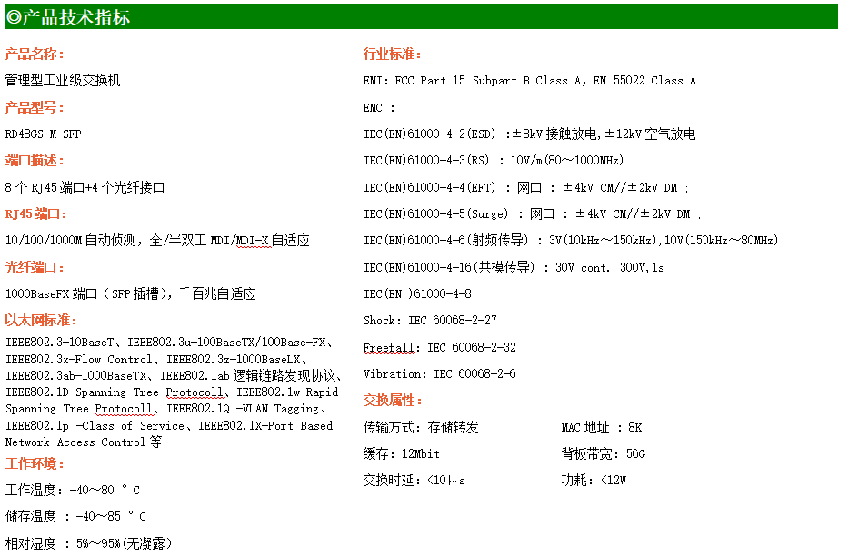 RD48GS-M-SFP是網(wǎng)管型工業(yè)以太網(wǎng)交換機(jī),產(chǎn)品支持4個千兆光口和8個千兆電口;支持工業(yè)現(xiàn)場所需的以太網(wǎng)二層協(xié)議,保證通信網(wǎng)絡(luò)的穩(wěn)定性;該系列交換機(jī)采用低功耗、無風(fēng)扇設(shè)計,確保無噪聲干擾,同時支持-40~80℃工作溫度和良好的EMC電磁兼容性能,保證在惡劣的工業(yè)環(huán)境中保持穩(wěn)定的工作,為工廠自動化,智能交通,視頻監(jiān)控等工業(yè)應(yīng)用領(lǐng)域組建快速穩(wěn)定的網(wǎng)絡(luò)終端接入網(wǎng)絡(luò)提供安全可靠的解決方案。