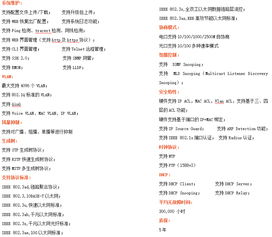 ●網絡冗余:支持STP/RSTP/MSTP,支持ERPS(自愈時間<20ms)