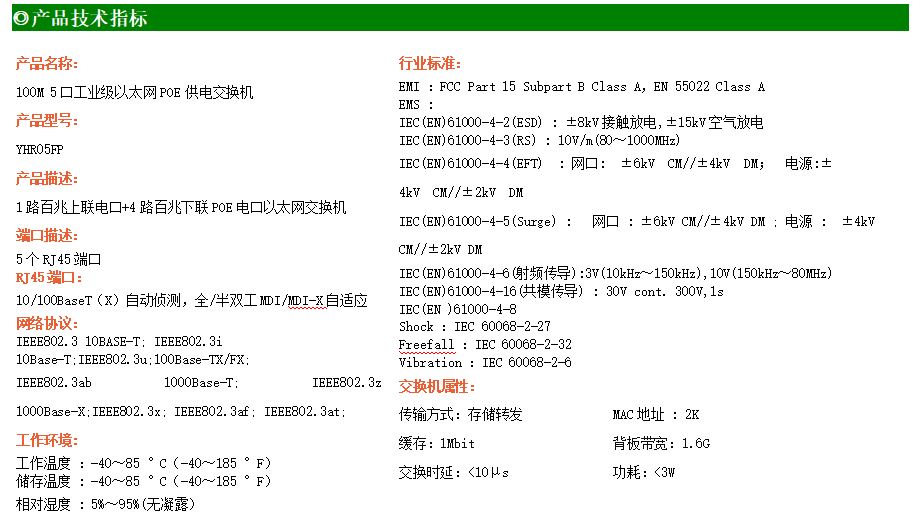 1路百兆上聯(lián)電口+4路百兆下聯(lián)電口工業(yè)級以太網(wǎng)POE交換機,支持1個10/100Base-TX上聯(lián)電口和4個10Base-T/100Base-TX下聯(lián)POE電口。產(chǎn)品符合FCC、CE、ROHS標(biāo)準(zhǔn)。YHR05FP交換機具有-40℃~85℃的工作溫度,具有超強的堅固度能適應(yīng)各種嚴(yán)苛環(huán)境,也可以非常方便的安置在空間緊湊的控制箱中。導(dǎo)軌的安裝特性、寬溫操作及擁有IP40防護等級的外殼及LED指示燈,使YH200-05FP成為一個即插即用的工業(yè)級設(shè)備,為用戶的以太網(wǎng)設(shè)備聯(lián)網(wǎng)提供可靠、便捷的解決方案。