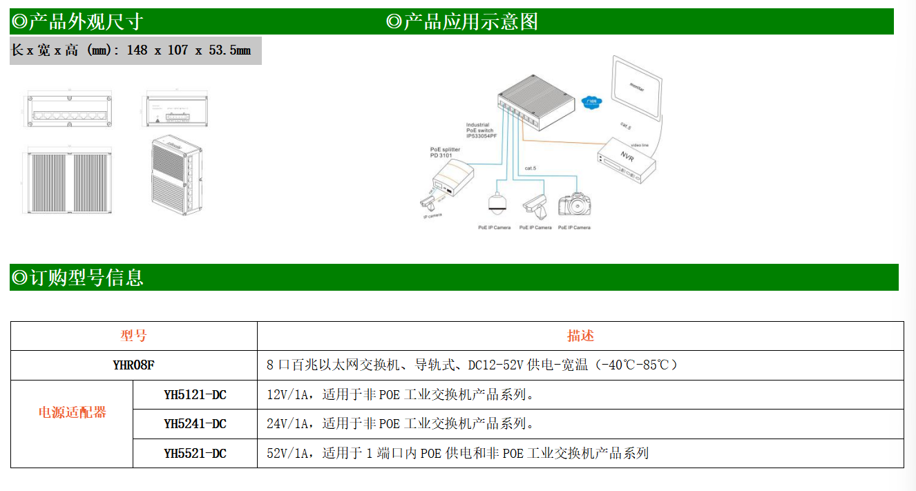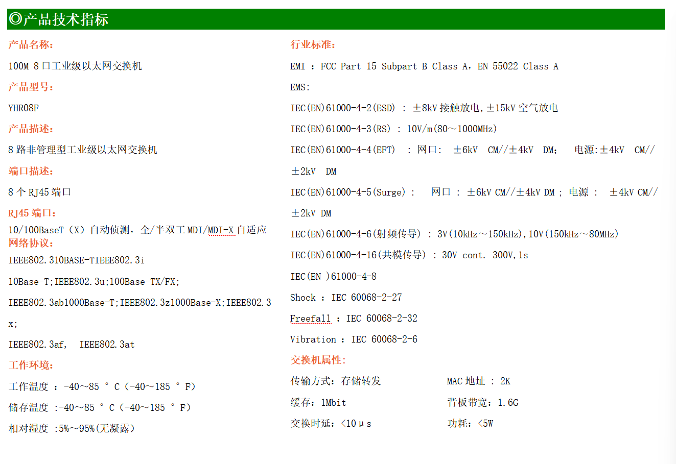 8路百兆電口工業級以太網交換機,支持8個10Base-T/100Base-TX電口。產品符合FCC、CE、ROHS標準。YH200-08F交換機具有-40℃~85℃的工作溫度,具有超強的堅固度能適應各種嚴苛環境,也可以非常方便的安置在空間緊湊的控制箱中。導軌的安裝特性、寬溫操作及擁有IP40防護等級的外殼及LED指示燈,使YHR08F成為一個即插即用的工業級設備,為用戶的以太網設備聯網提供可靠、便捷的解決方案。