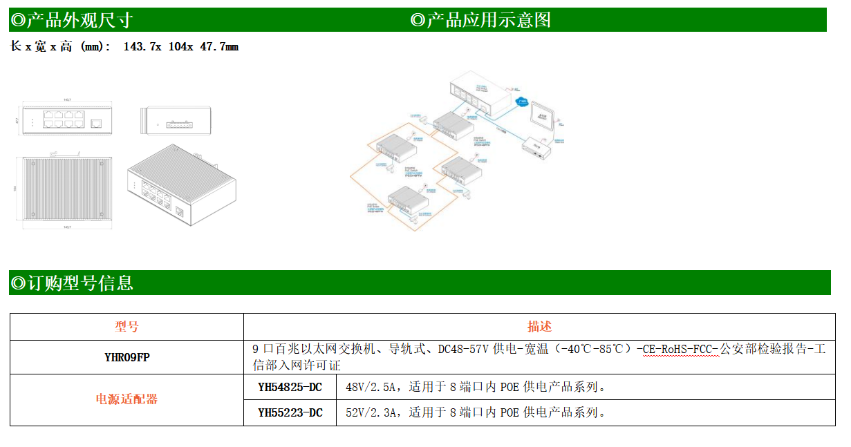 9路百兆電口工業級以太網交換機,支持9個10Base-T/100Base-TX電口。產品符合FCC、CE、ROHS標準。YH200-09FP交換機具有-40℃~85℃的工作溫度,具有超強的堅固度能適應各種嚴苛環境,也可以非常方便的安置在空間緊湊的控制箱中。導軌的安裝特性、寬溫操作及擁有IP40防護等級的外殼及LED指示燈,使YHR09FP成為一個即插即用的工業級設備,為用戶的以太網設備聯網提供可靠、便捷的解決方案。