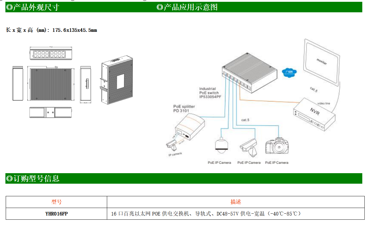 16路百兆電口工業級以太網交換機,支持16個10Base-T/100Base-TX POE電口。產品符合FCC、CE、ROHS標準。YHR016FP交換機具有-40℃~85℃的工作溫度,具有超強的堅固度能適應各種嚴苛環境,也可以非常方便的安置在空間緊湊的控制箱中。導軌的安裝特性、寬溫操作及擁有IP40防護等級的外殼及LED指示燈,使YH200-016FP成為一個即插即用的工業級設備,為用戶的以太網設備聯網提供可靠、便捷的解決方案。