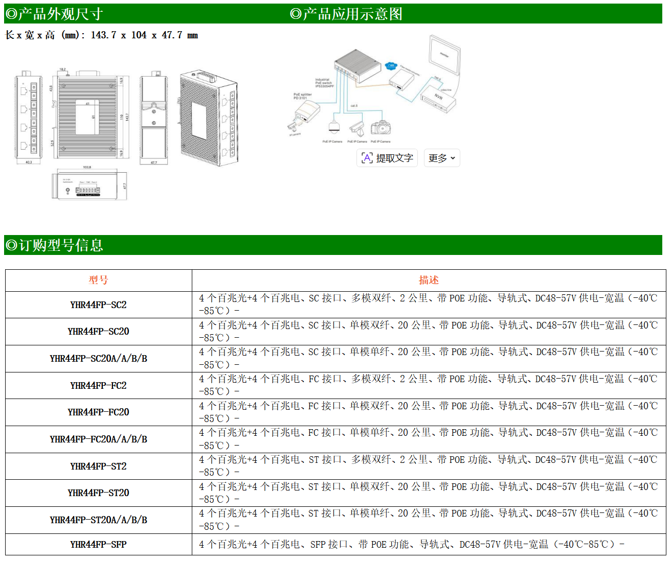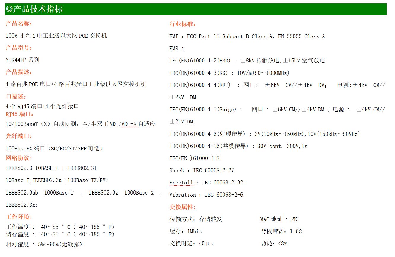 4路百兆POE電口+4路百兆FX光口工業(yè)級(jí)以太網(wǎng)交換機(jī),支持4個(gè)10Base-T/100Base-TX電口和4個(gè)100Base-X光口。產(chǎn)品符合FCC、CE、ROHS標(biāo)準(zhǔn)。YH200-44FP系列交換機(jī)具有-40℃~85℃的工作溫度,具有超強(qiáng)的堅(jiān)固度能適應(yīng)各種嚴(yán)苛環(huán)境,也可以非常方便的安置在空間緊湊的控制箱中。導(dǎo)軌的安裝特性、寬溫操作及擁有IP40防護(hù)等級(jí)的外殼及LED指示燈,使YH200-44FP成為一個(gè)即插即用的工業(yè)級(jí)設(shè)備,為用戶的以太網(wǎng)設(shè)備聯(lián)網(wǎng)提供可靠、便捷的解決方案。