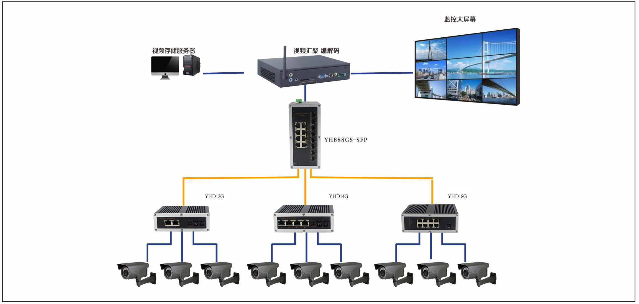 宇航在自動化報警系統(tǒng)解決方案采用了YH688GS-SFP, YHD18G, YHD14G, YHD12G, 工業(yè)以太網(wǎng)交換機進行轉(zhuǎn)發(fā),現(xiàn)場變電站在監(jiān)控與存儲視頻信息的同時,交換機將各個變電站的視頻信息上傳到電力局中心千兆骨干網(wǎng)監(jiān)控中心。實現(xiàn)監(jiān)控中心遠程監(jiān)控下級變電站的遠程圖像,進而綜合實現(xiàn)視頻監(jiān)控及聯(lián)動報警的功能。
