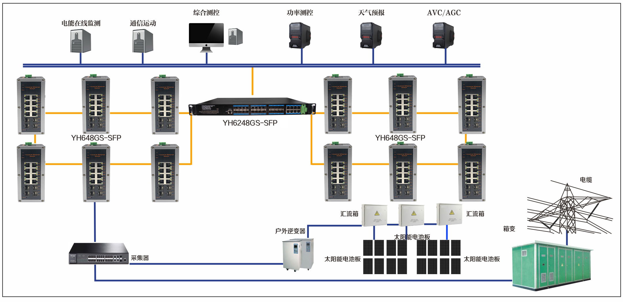 宇航在光伏發(fā)電站監(jiān)控系統(tǒng)解決方案中采用了YH6248GS-SFP,YH648GS-SFP經(jīng)數(shù)據(jù)采集,網(wǎng)絡(luò)傳輸,中心監(jiān)控,以及使用端口匯聚實(shí)現(xiàn)上傳至站控制層的鏈接冗余。核心機(jī)房由宇航工業(yè)以太網(wǎng)交換機(jī)YH6248GS-SFP組成,YH6248GS-SFP匯聚多個(gè)環(huán)網(wǎng)數(shù)據(jù)流量。由YH648GS-SFP工業(yè)以太網(wǎng)交換機(jī)組成多個(gè)千兆冗余環(huán)網(wǎng)組成冗余協(xié)議,每個(gè)環(huán)網(wǎng)通過(guò)物理相隔離,提高網(wǎng)絡(luò)的安全性,保障了網(wǎng)絡(luò)的無(wú)憂切換。