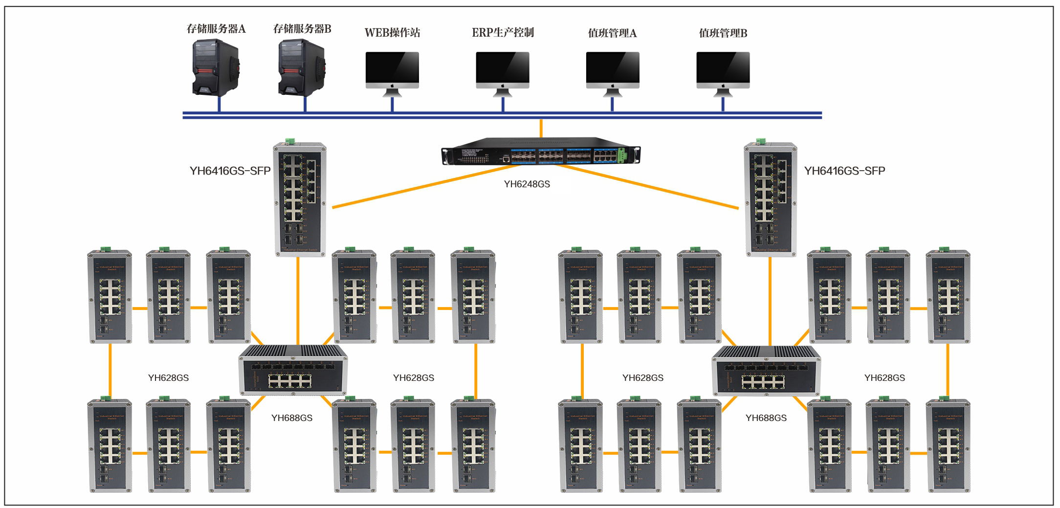 宇航在鋼鐵自動化生產(chǎn)線監(jiān)控解決方案中采用了YH6248GS-SFP,YH688GS,YH6416GS-SFP工業(yè)以太網(wǎng)交換機構(gòu)筑各個車間內(nèi)部通信網(wǎng)絡(luò),在車間內(nèi)部通過YH628GS千兆工業(yè)以太網(wǎng)構(gòu)筑環(huán)網(wǎng),針對實際的站點進行合理的分布,通過虛擬局域網(wǎng)技術(shù)對各個車間之間的數(shù)據(jù)進行邏輯隔離,保證通信的安全性。